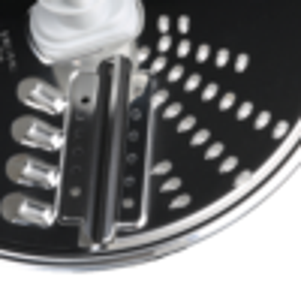 Een tweezijdige snijschijf van hoogwaardig staal waarvan de sterke en scherpe messen een grote verscheidenheid aan ingrediënten snijden.